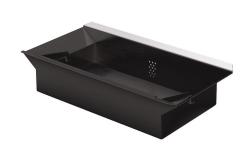 Askeløsningen er et brett som plasseres oppå brennplatene i ildstedet. Den kommer med et håndtak og asken løftes dermed enkelt ut når du skal tømme peisen eller ovnen.