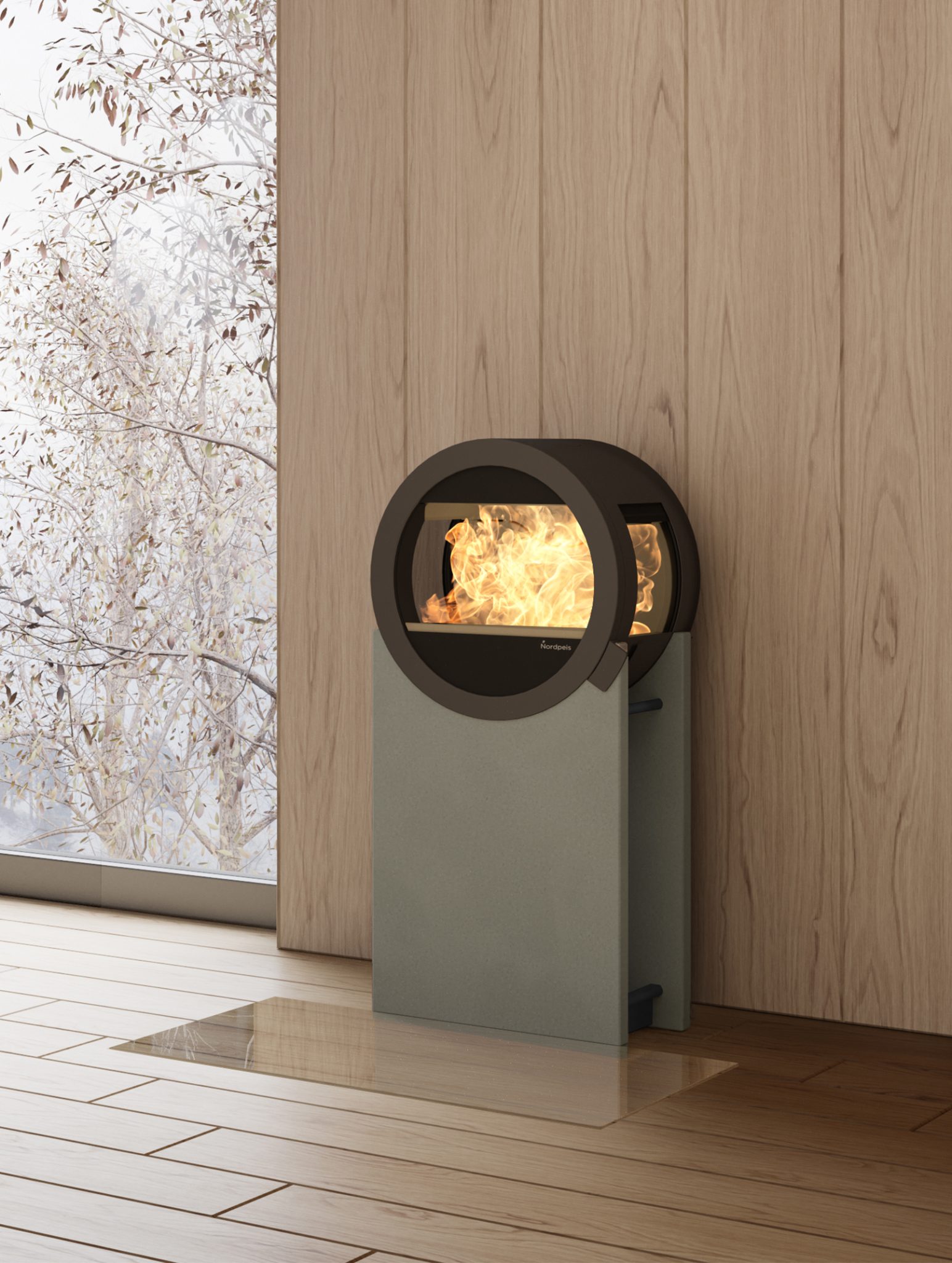 Den særegne runde formen på brennkammeret skiller seg ut. Peiskammeret i sort stål hviler på en søyle i betong.