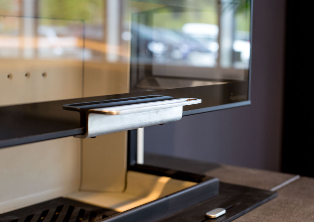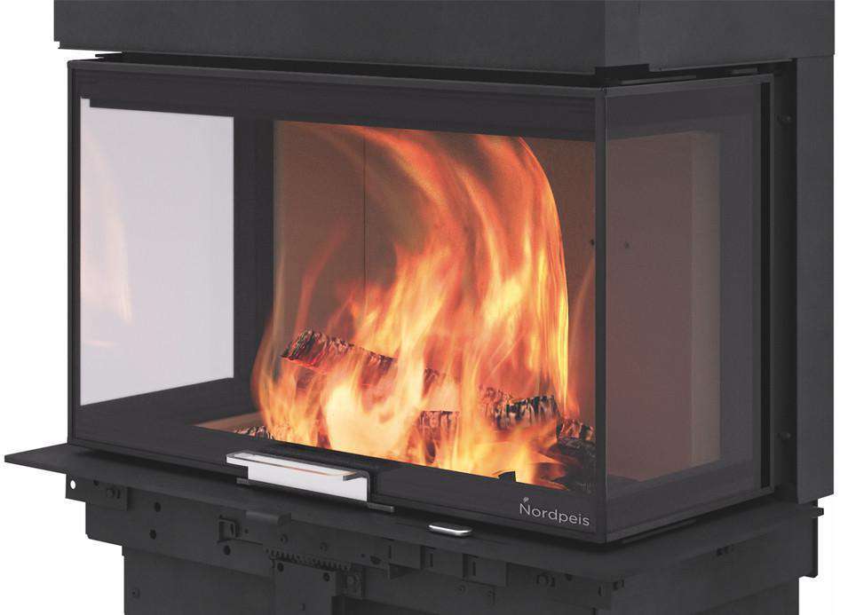 Nordpeis Q-34UL er en stor innsats med en ekslusiv heve- og senkedør og innsyn til flammene fra tre sider. Innsatsen har et minimalistisk ytre, med flotte detaljer i børstet stål.