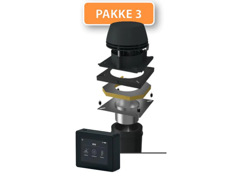 Pakke 3 består av nødvendige deler for tilkobling til stålpipe, til bruk på et ildsted med lukket dør.