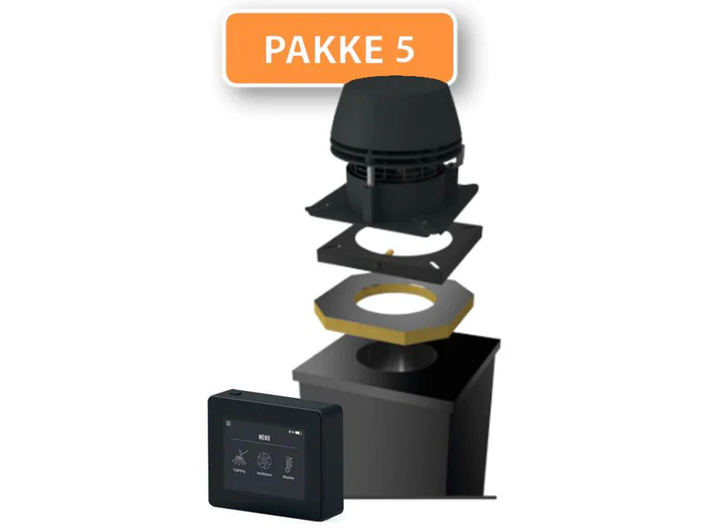 Pakke 5 består av nødvendige deler for tilkobling til en mur -eller elementpipe, til bruk på en åpen peis eller 2 ildsteder